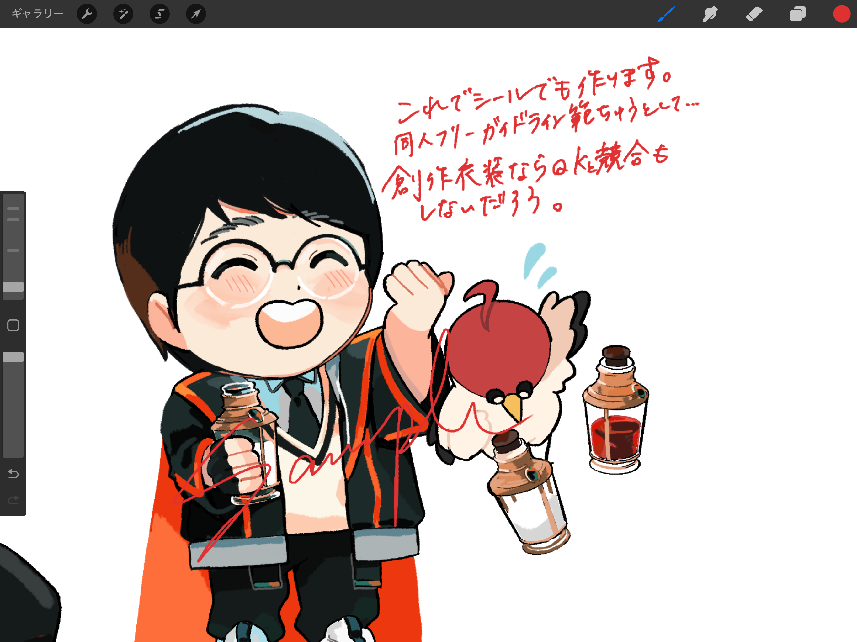 問さん→デフォルメ感が出ない、特に目がむずかしい。笑っている時に目を瞑った笑顔として処理すべきか迷う。目尻の処理がデフォルメの引き算を加速する。定まっておらず。