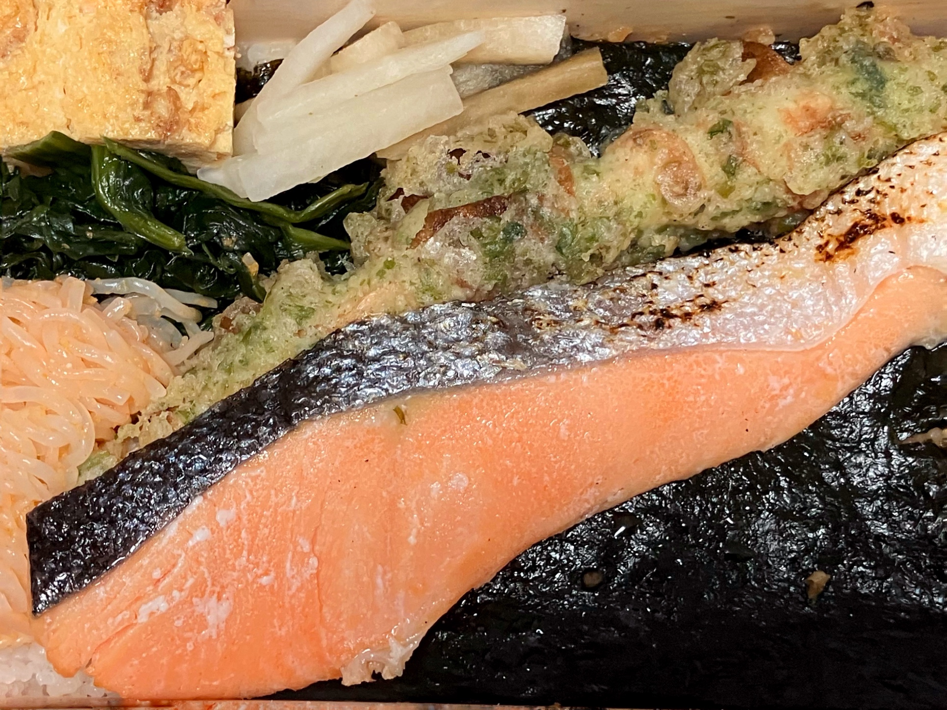 のりが二層になっているのり弁!焼き鮭とあげちくわの入った「海」をいただきました。温めていなかったことに書いている今気づいたぐらい、そのままでも美味しいのり弁でした。小さめかな?と思ったけど、案外がっつり美味しく醤油が効いていて、こってり目で最高でした。