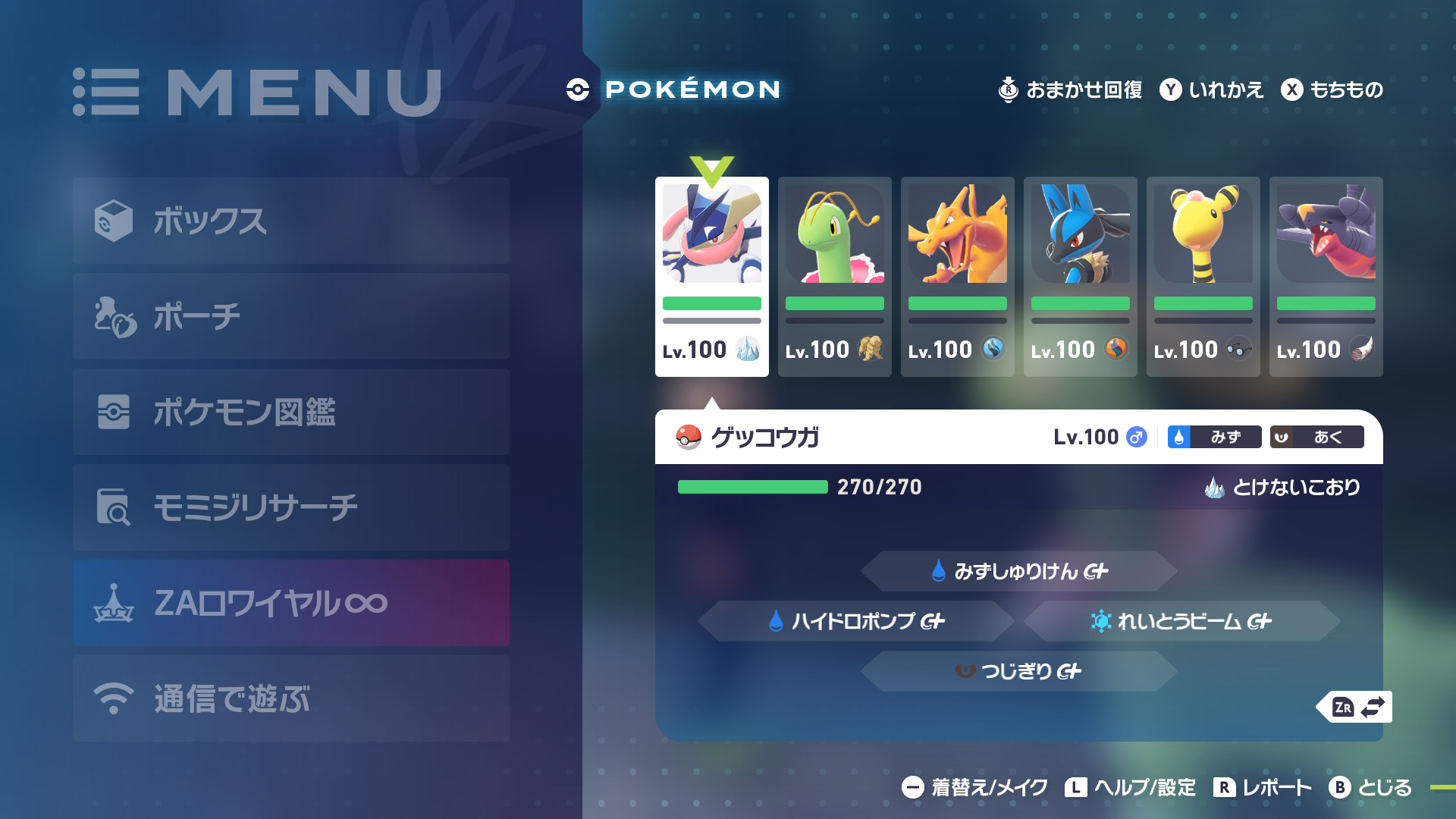 バクフーンの次に好きなポケモン、ゲッコウガ。スマブラで出会って惚れたので、ポケモン本編では触れたことがありませんでした。初めてポケモンの作内で旅をできて嬉しかった!素早く繰り出せるみずしゅりけんを多用しました。メガシンカの宙吊りになっている様もかっこよくて大好き!連れることができて幸せでした。