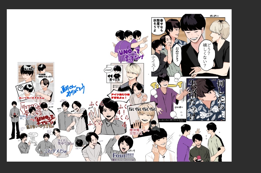 問さん→デフォルメ感が出ない、特に目がむずかしい。笑っている時に目を瞑った笑顔として処理すべきか迷う。目尻の処理がデフォルメの引き算を加速する。定まっておらず。