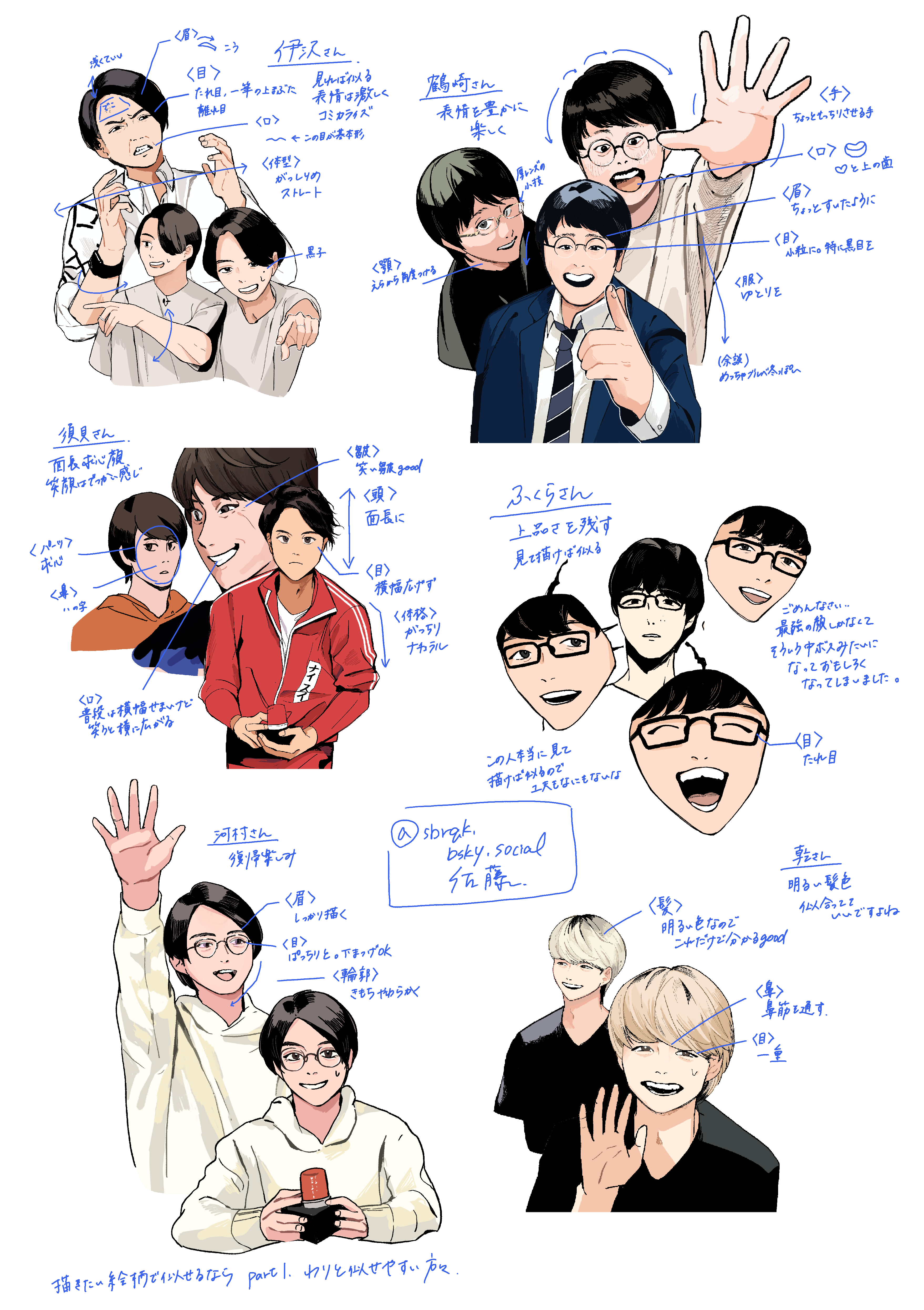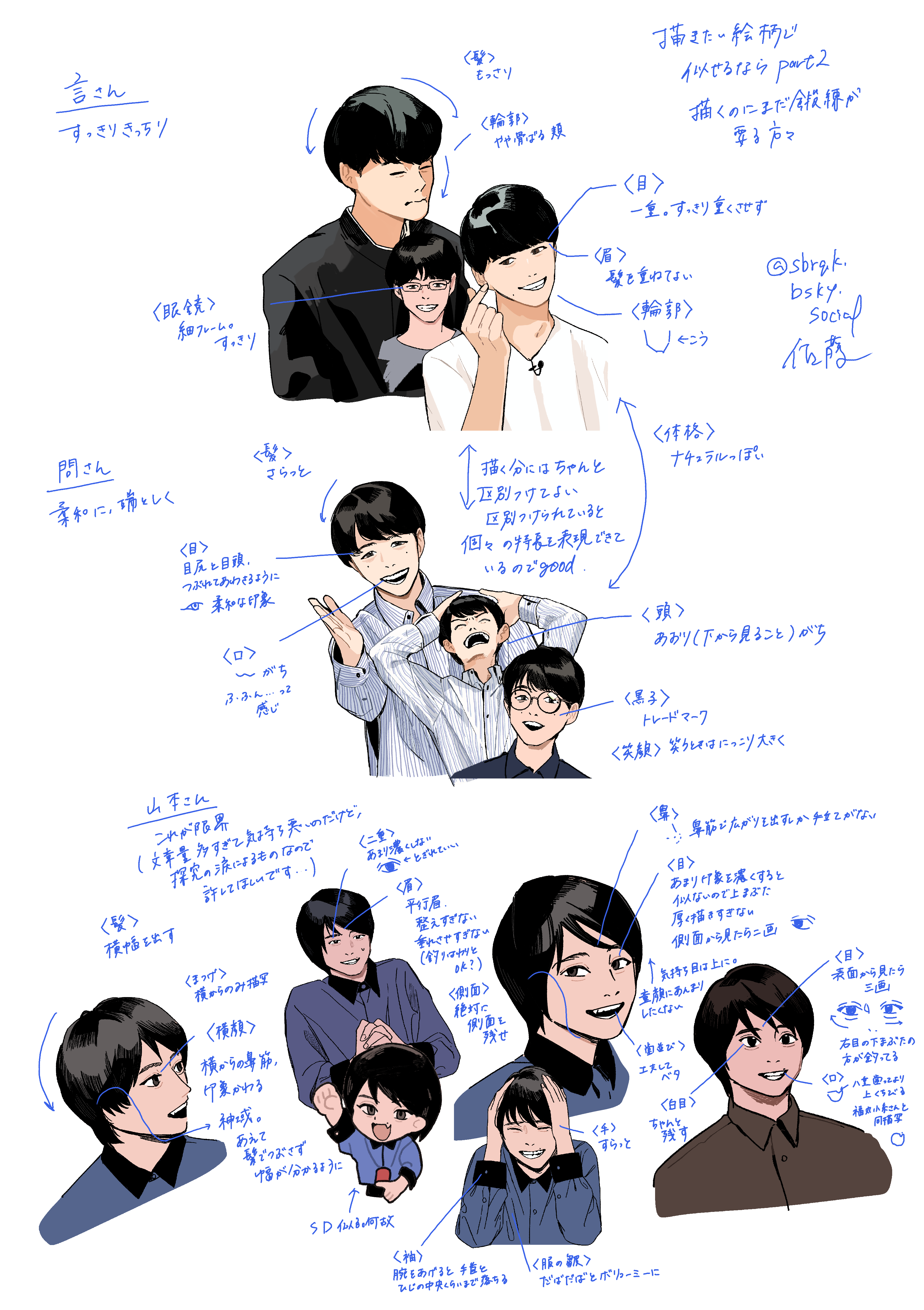 鶴崎さん→見ながら描いてもちょっと工夫がいる。斜め・横向いたら輪郭が特徴的なので楽。目は小粒目だけど瞳孔は小さく、眉はあえて抜く感じ、ハートっぽい口。あまり柄物着ないから工数が減るのも最高。メガネの厚で輪郭を途切れさせるやつやると、小技キいて上手くなった気分になれる。ありがとう。