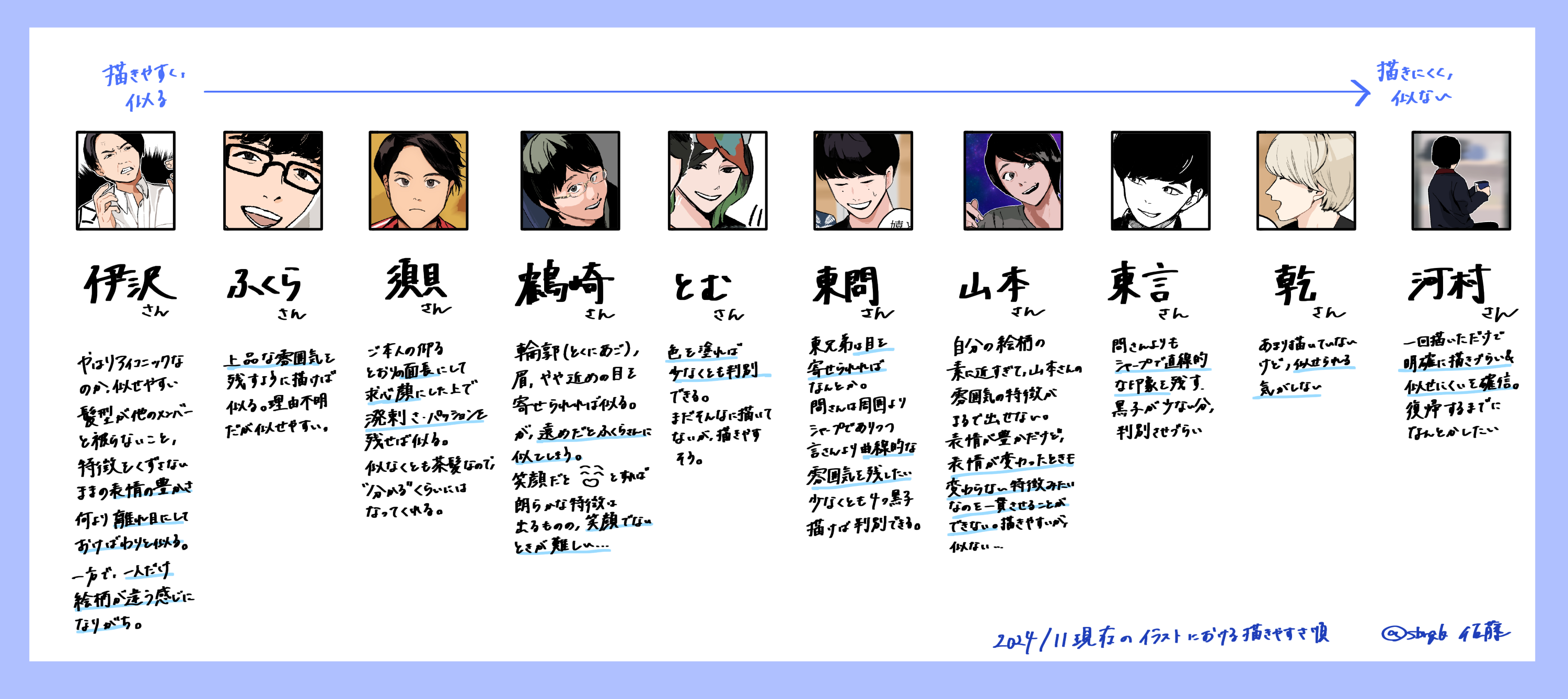 画面に映っている事実をなるべく描きつつも、その場面を見て自分が抱いた感情や感想を元に、表情や画角を変えてカートゥーン化した上で、二次元として絵の良さを保たせるのがすごく楽しい。