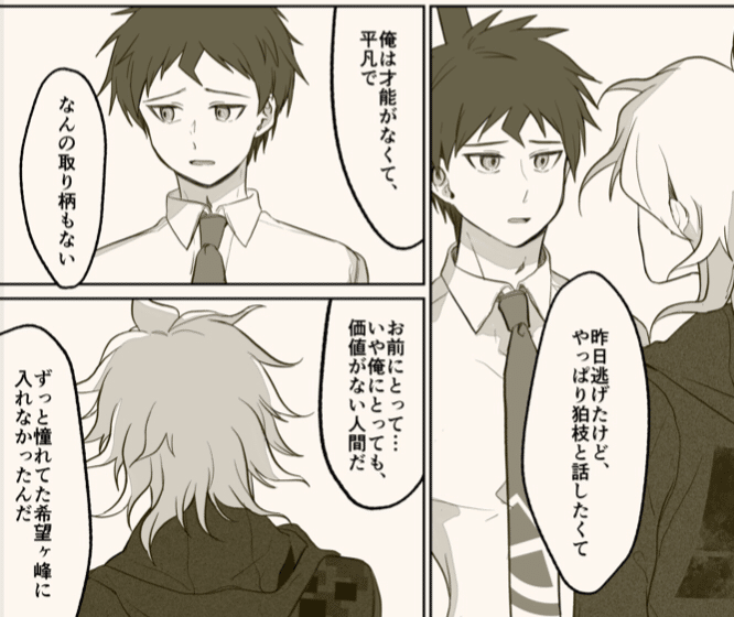 狛枝と日向は才能に対する価値観が似ています。才能の有無が絶対で、才能こそが人間の価値です。