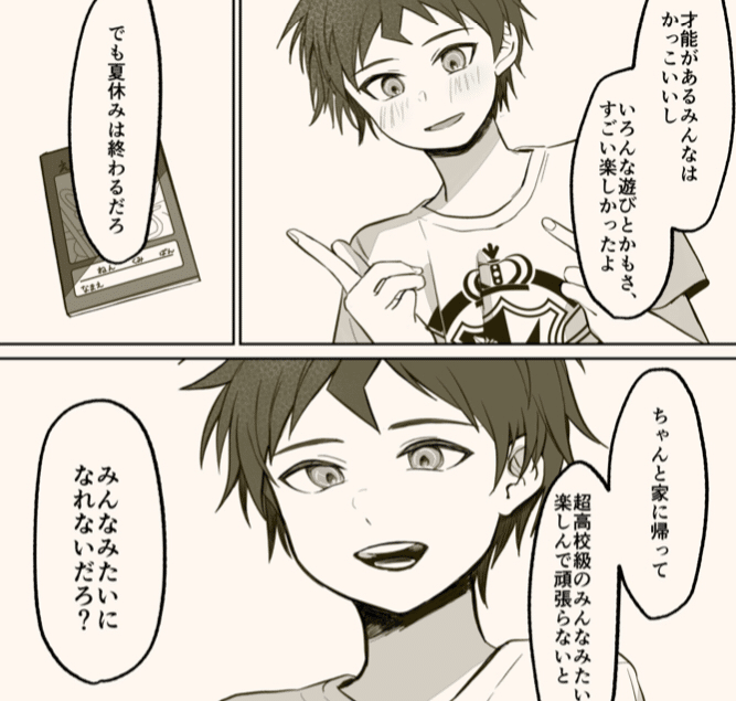 日向には才能に折り合いをつけるための出会いが足りなかったと解釈しています。どこかで日向の意識の高さに見合う友人や日向が幻覚のように見てきた「希望ヶ峰本科生」の実情に出会っていればカムプロ回避はできたのかなと思ってます。