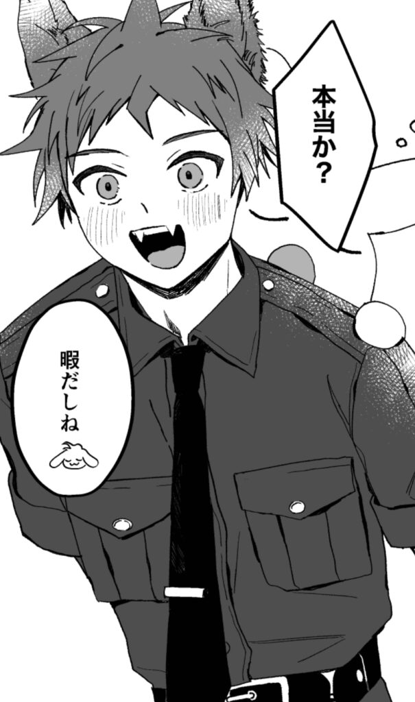 カードの青い小さなキラキラが星空や砂時計みたいでなんだか少し切なくて物語ともピッタリで何度も眺めています。いぬのおまわりさんはイベントで拝見していましたが、本で手に取るとより一コマずつ細部まで見れて、人型も獣もどのコマも可愛すぎて、撫で撫でしながら読んでました!狛枝くんが一緒に行くよって言った後のコマが特にかわいくて、耳の毛短くツンツンにまんまるな瞳でかわいいねぇ….。って思いながら撫でまくってました!
